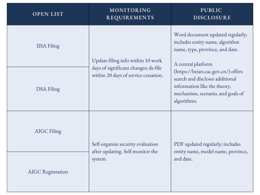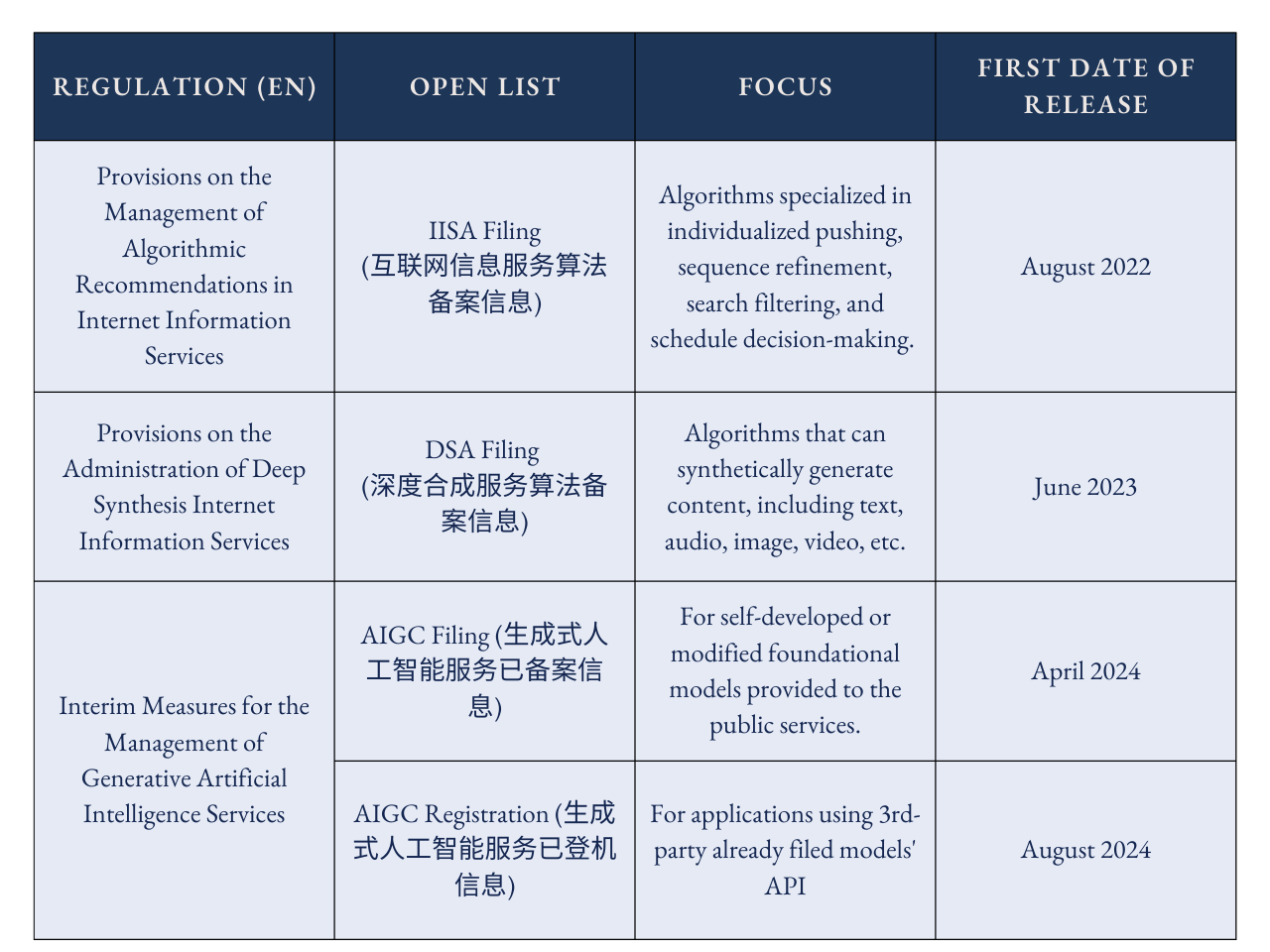 Based on these 3 regulations, the regulators maintain four lists of AI-related services in China that are open to the public.