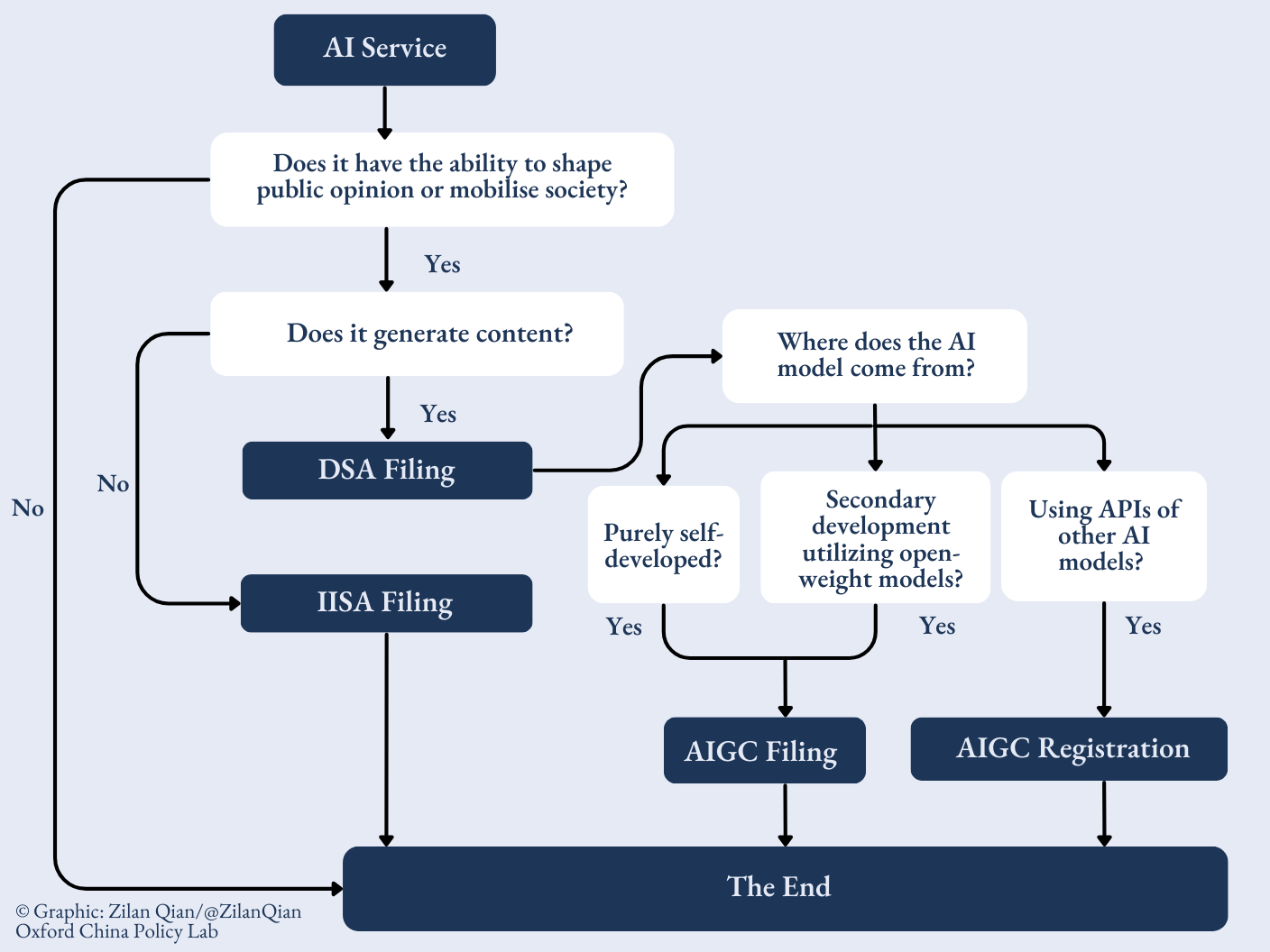 In reality, DSA filing is typically mandatory before the launch of a service, while AIGC filing is often secondary. Some companies file DSA first and wait to see if regulators require AIGC filing, while others proactively file AIGC to signal credibility, especially if serving government or business clients. Enforcement patterns suggest that top companies in the market, foreign-invested companies, and public-facing paid services are more likely to be required to conduct AIGC filing or registration.10