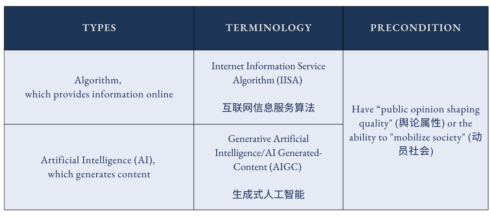 Chinese regulators have established a registry system for AI services, classifying them into two categories: algorithms for providing online information and AI used for content generation (also referred to as AI Generated-Content or AIGC).1 Crucially, only those services with the capacity to “shape public opinion” or “mobilize society” – meaning they can potentially challenge existing public discourse or increase social instability – are subject to the registry requirements.2 Conversely, AI algorithms or generated content that lack this ability are exempt from the regulations outlined here.