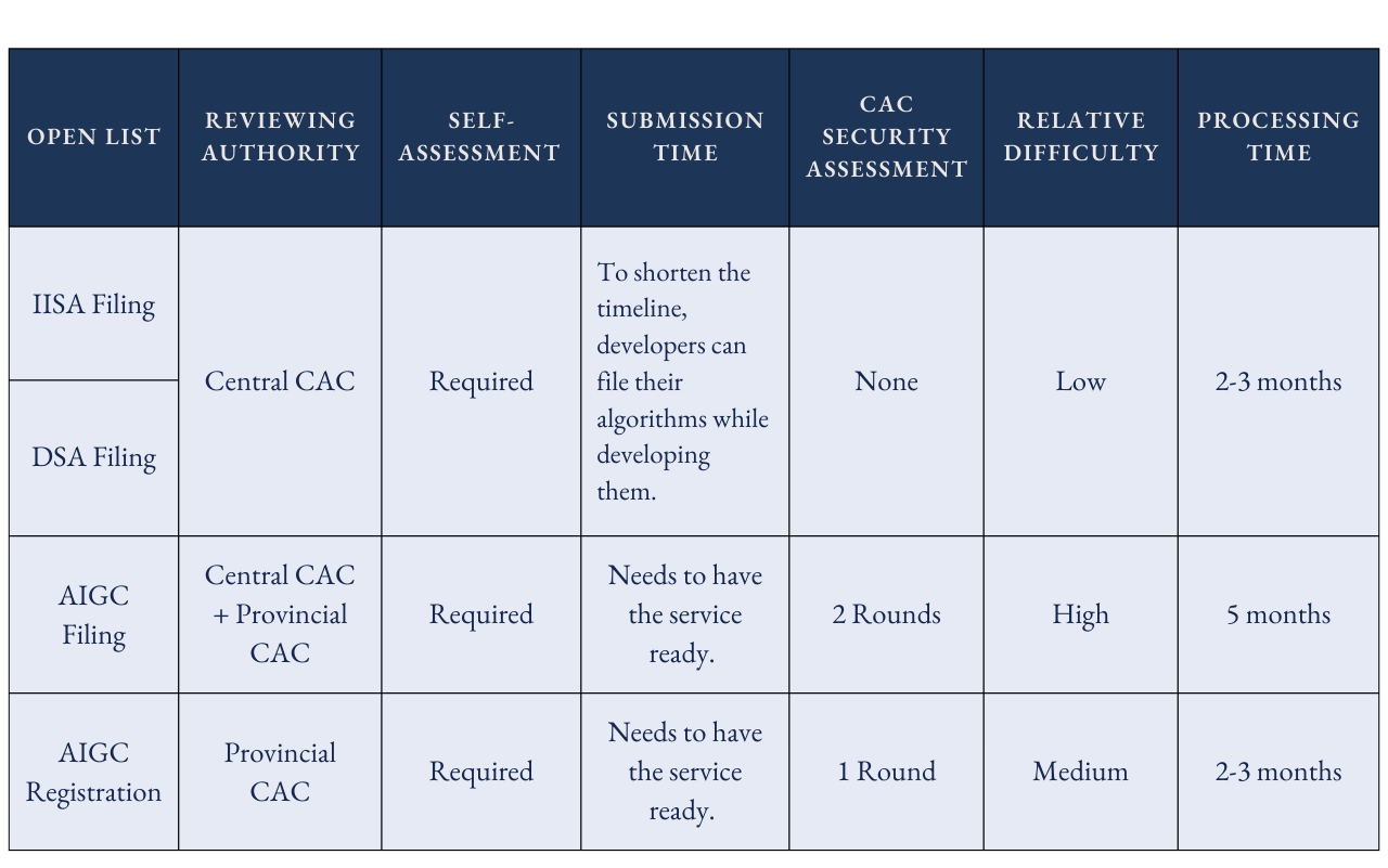 To make AI services within the aforementioned 4 open lists, companies must follow at least one of the three processes. The Cyberspace Administration of China (CAC), China’s top internet regulator with both state and provincial level presences, oversees all three processes.