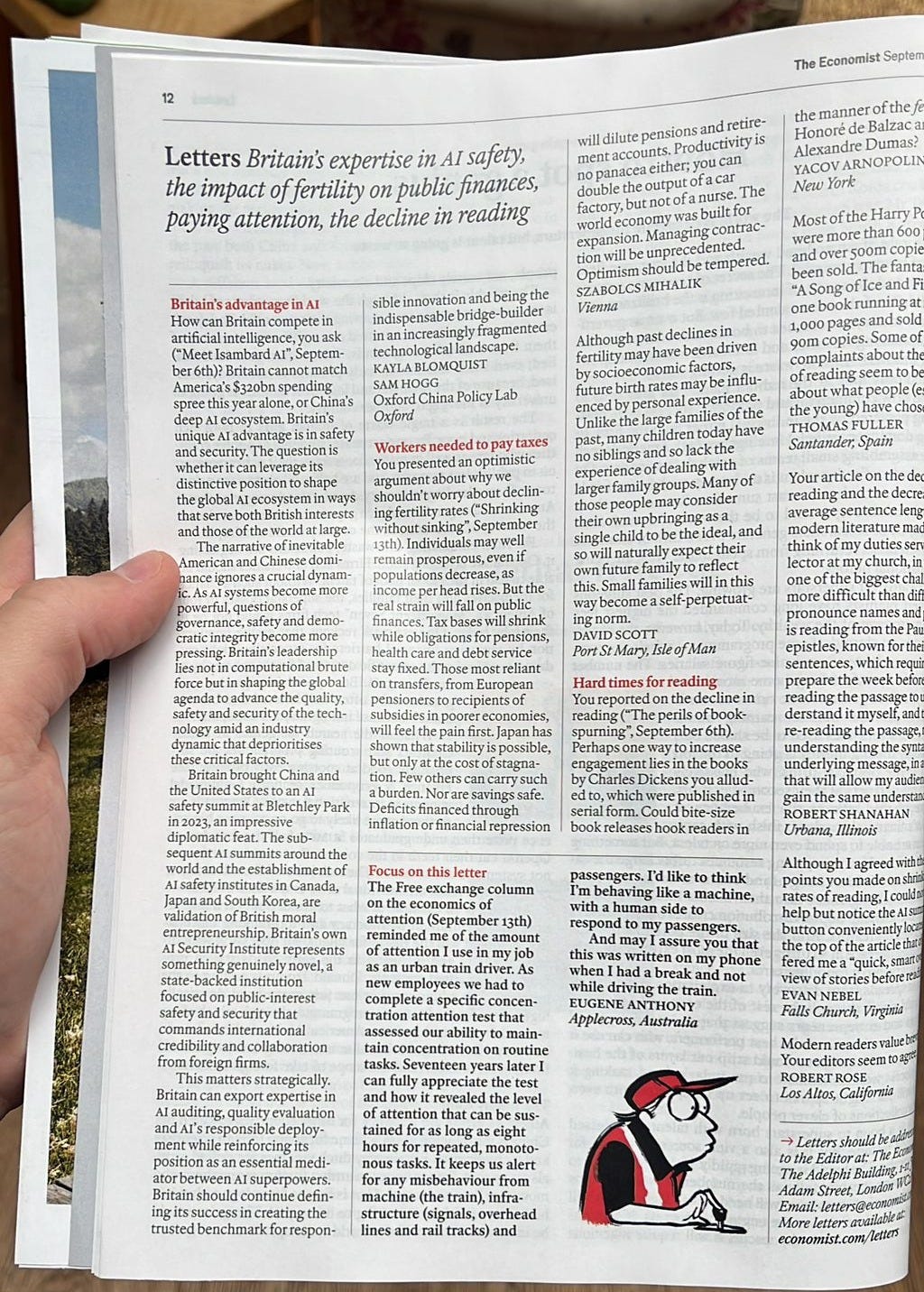 Kayla Blomquist and Sam Hogg were published in The Economist. In the leading letter, they argue that Britain can export expertise in AI auditing, quality evaluation and AI’s responsible deployment while reinforcing its position as an essential mediator between AI superpowers.